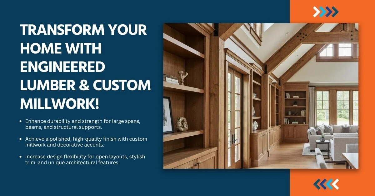 Want to expose beams or highlight ceilings? Engineered lumber allows long-span beams that resist warping or sagging, so you can have lofty cathedral ceilings, lofts, or open layouts without heavy bulk. Pair with millwork trim to hide transitions or to add decorative elements that bring warmth.